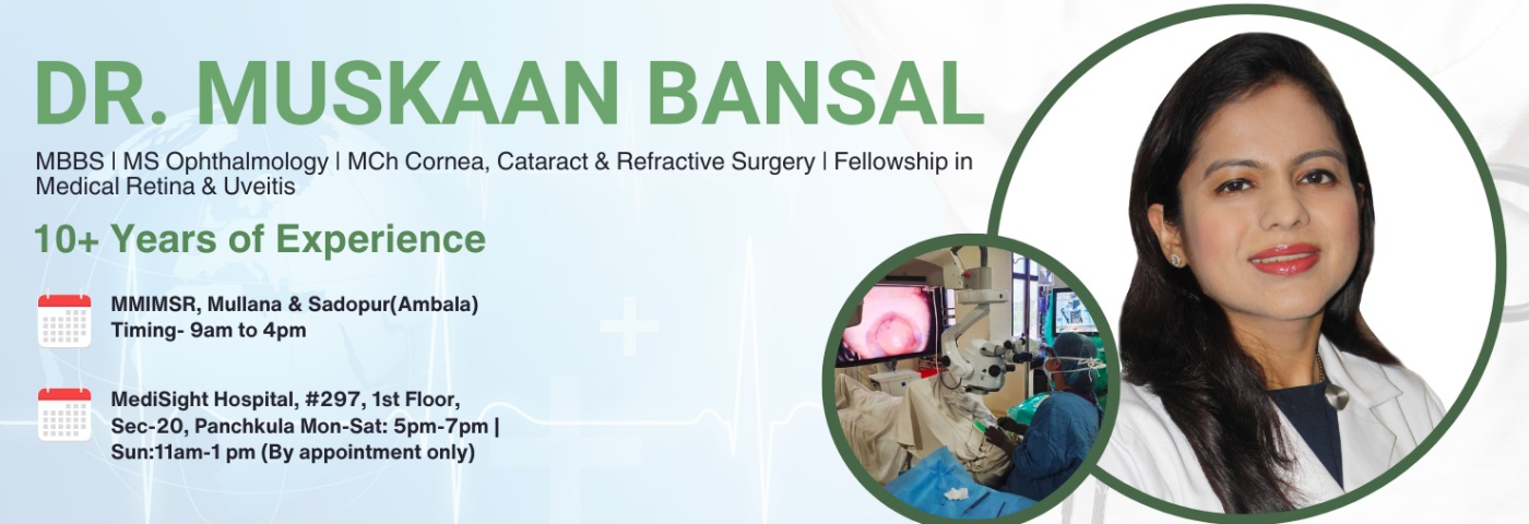 Read MoreDr Muskaan Bansal is an accomplished ophthalmologist in the field of eye care, dedicated to providing personalized, compassionate care to preserve and enhance the precious gift of vision. With a strong academic foundation and numerous accolades in field of ophthalmology , she brings expertise , innovation ,and empathy to every patient interaction. Her Academic Journey is from the best institutions of the country. • MBBS (2011-2016): Maulana Azad Medical College, Delhi • MS Ophthalmology (2017-2020): PGIMER, Chandigarh • MCh Cornea, Cataract & Refractive...